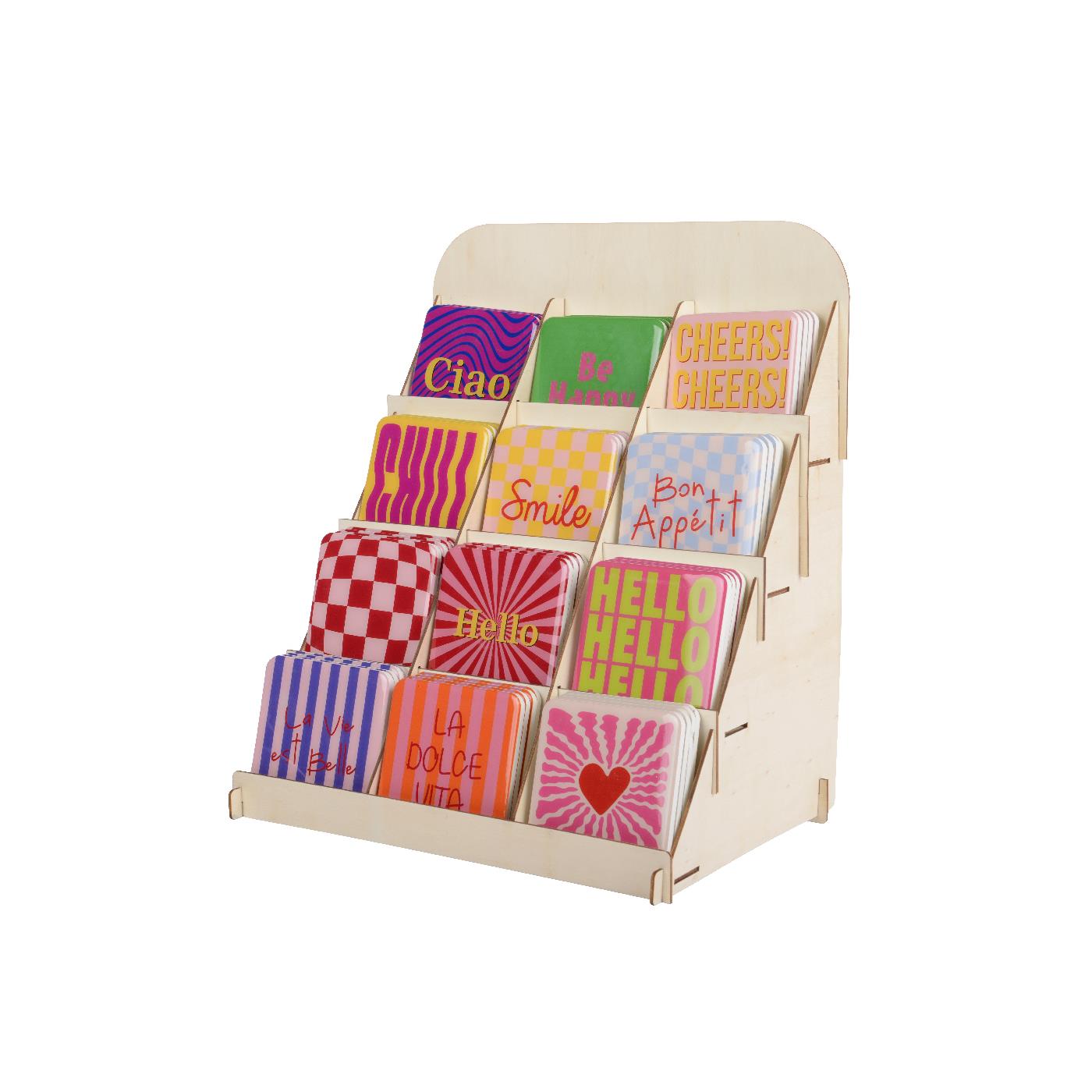 Decoratie Bordje met tekst vurenhout 9,5x9,5x0,5cm 12 assorti