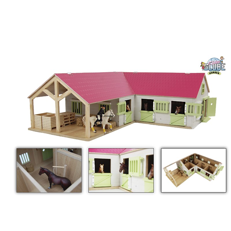 Kids Globe paardenhoekstal met 3 boxen en berging 1:24 68x77x27cm roze (exclusief accessoires)
