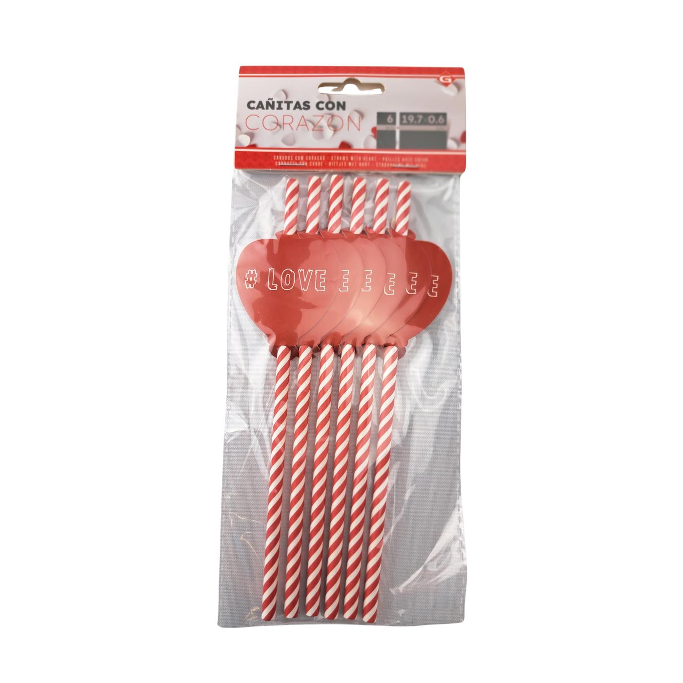Set van 6 rietjes met hart 19,7x0,6 cm